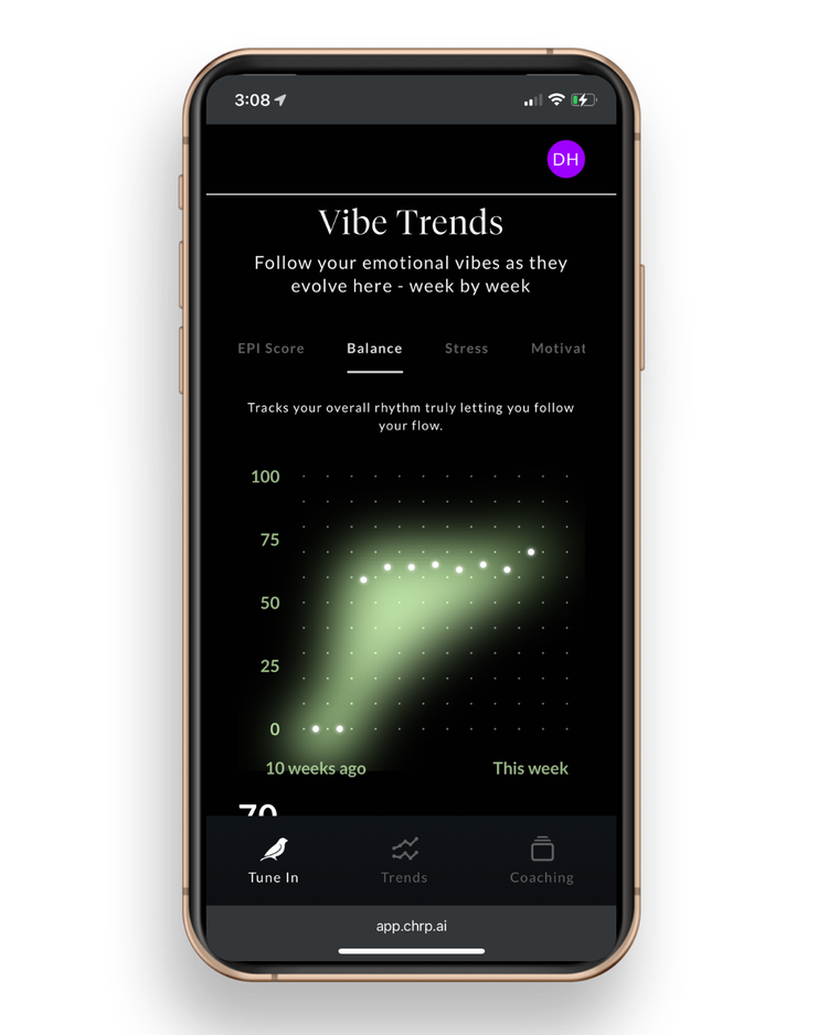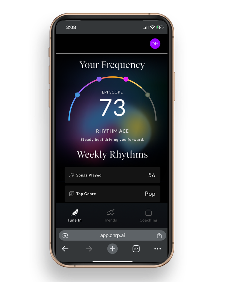 Your listening reveals more than you think. CHRP translates your music habits into scores for energy, stress, balance, and more—so you can finally see what you’ve been feeling.